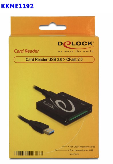 Il lettore di schede Delock può essere utilizzato per la lettura e scrittura schede di memoria CFast. Questo lettore di schede può essere collegato ad un PC o laptop tramite l'interfaccia USB Tipo-A. • Connettori: 1 x USB 3.0 Tipo Micro-B femmina > 1 x slot CFast 2.0 • Velocità di trasferimento dati fino a: SuperSpeed USB 5 Gbps, Hi-Speed 480 Mbps, Full-Speed 12 Mbps, Low-Speed 1,5 Mbps • Supporta CFast typo I / II schede di memorie • Retrocompatibile con CFast 1.0 • Materiale custodia: alluminio • Dimensioni (LxPxA): ca. 82 x 60 x 12 mm • Colore: nero • Hot Swap, Plug & Play