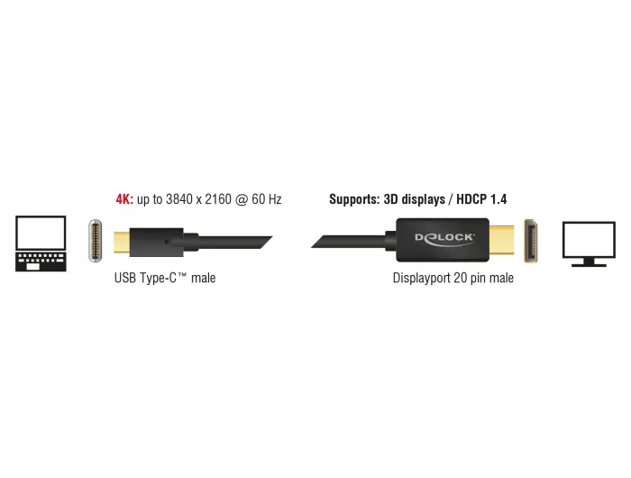 Questo cavo Delock consente il collegamento di un monitor DisplayPort ad un PC o laptop con la porta USB-C™ o Thunderbolt™ 3, quali MacBook o Chromebook. L'interfaccia deve supportare la modalità alternativa DisplayPort.