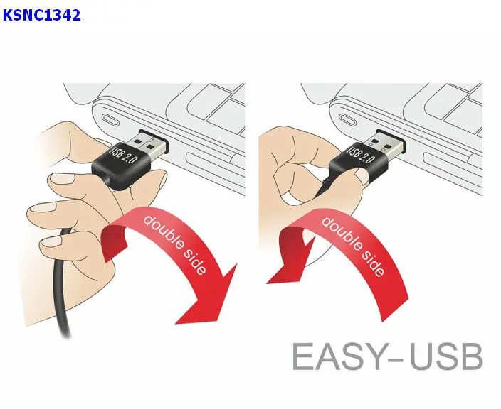 This cable by Delock with EASY-USB male can be plugged into the USB A female port in both directions. Thus the male port can be used both-sided and make the plug in easily.