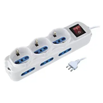 CAVO 1,5 mt. con spina italiana 16A - 3 prese di corrente per spine italiane (10A) e schuko - 6 prese di corrente per spine italiane (10/16A) - Fori con protezione per bambini - Completa di interruttore luminoso - Cavo di alimentazione lungo 1,5 mt. con spina italiana 16A Prese: 6 x 2P+T 10/16A bipasso + 3 x 10A italiana/Schuko Interruttore luminoso: sì Protezione bambini: si Occhielli di fissaggio: sì Voltaggio massimo: 250V/2500W Cavo: H05VV-F 3G 1.0 mm2 - 1.5 mt. Spina: Italiana 16A (tipo L)