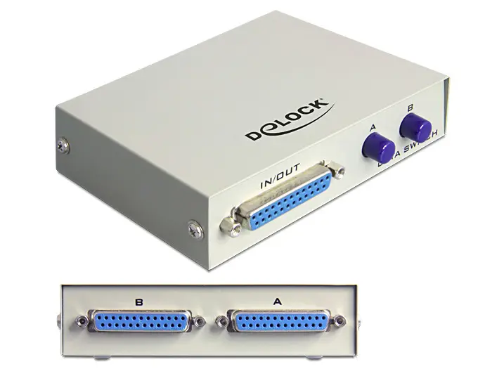 This Delock parallel switch can be used for e.g. connection of your printer with parallel port to two systems by the help of the switch. By using one of the buttons you can manually select which system should be connected to the device. For the switch you do not need a power supply.