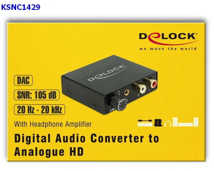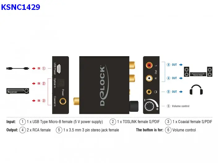 Il convertitore audio digitale (DAC) Delock converte un segnale audio digitale in un segnale stereo analogico. Ad esempio, un lettore DVD o Blu-ray può essere collegato all'ingresso del dispositivo e il segnale può essere fornito tramite TOSLINK ottico o tramite collegamento coassiale S/PDIF. Alla porta di uscita, il segnale audio viene trasmesso tramite connessione RCA. Inoltre, sono integrati un jack per cuffie e un controllo del volume.