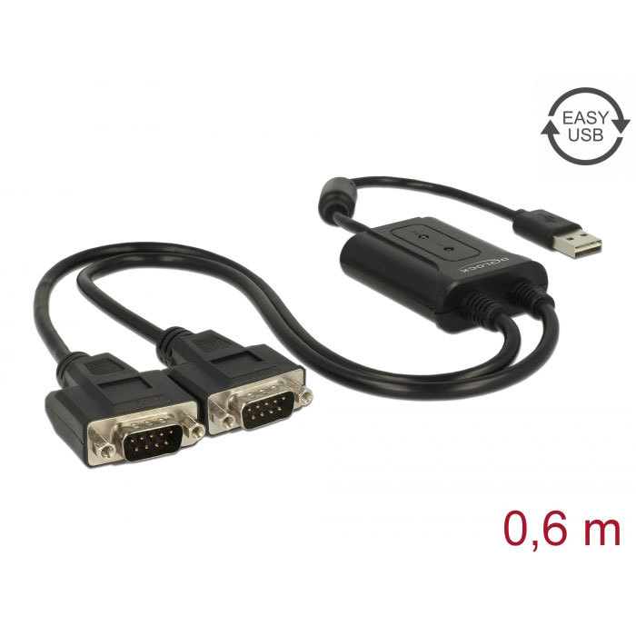 Questo adattatore seriale EASY-USB Tipo-A Delock offre due interfacce RS-232 DB9 per stampanti, strumenti di misura, controllori, dispositivi IoT ecc.