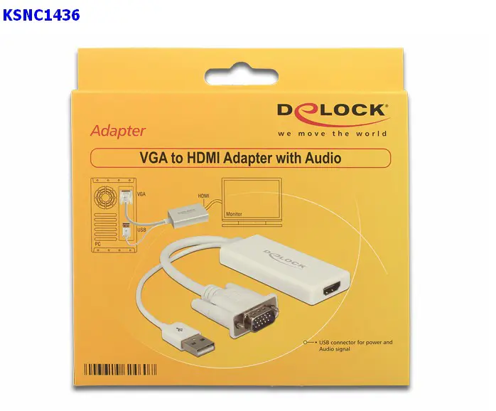 This VGA to HDMI adapter by Delock can be used for the connection of a HDMI display to your PC or notebook. The USB connector serves the audio transmission and also power supply.