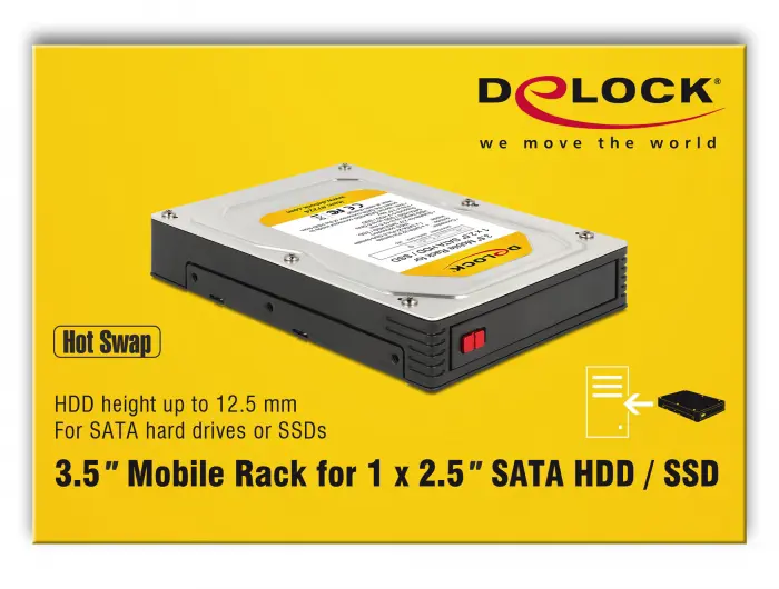 Description This metal mobile rack can be mounted into a free 3.5? bay of your desktop PC. A 2.5? SATA hard drive or SSD can be directly inserted into the frame. The Hot Swap function allows you to exchange the hard drive also during operation (the system must support Hot Swap).