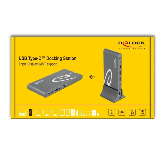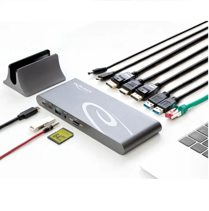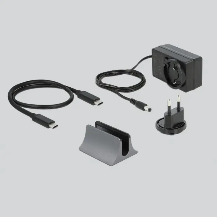Stand: La docking station Delock può essere utilizzata sia orizzontalmente che verticalmente. È incluso un supporto per il funzionamento verticale.