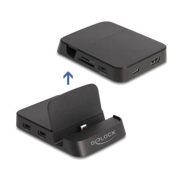 Delock Docking station per smartphone 4K con supporto integrato - HDMI / USB / Hub / SD / Micro SD per Android o Windows Questa docking station per smartphone Delock è l'aggiunta ideale alla scrivania o in viaggio e trasforma uno smartphone in un sistema desktop completo. Oltre a 3 porte USB Tipo-A plug & play, offre anche un'interfaccia HDMI e uno slot SD e Micro SD per schede di memoria. L'uscita HDMI consente di utilizzare un monitor con una risoluzione massima di 4K 30 Hz.