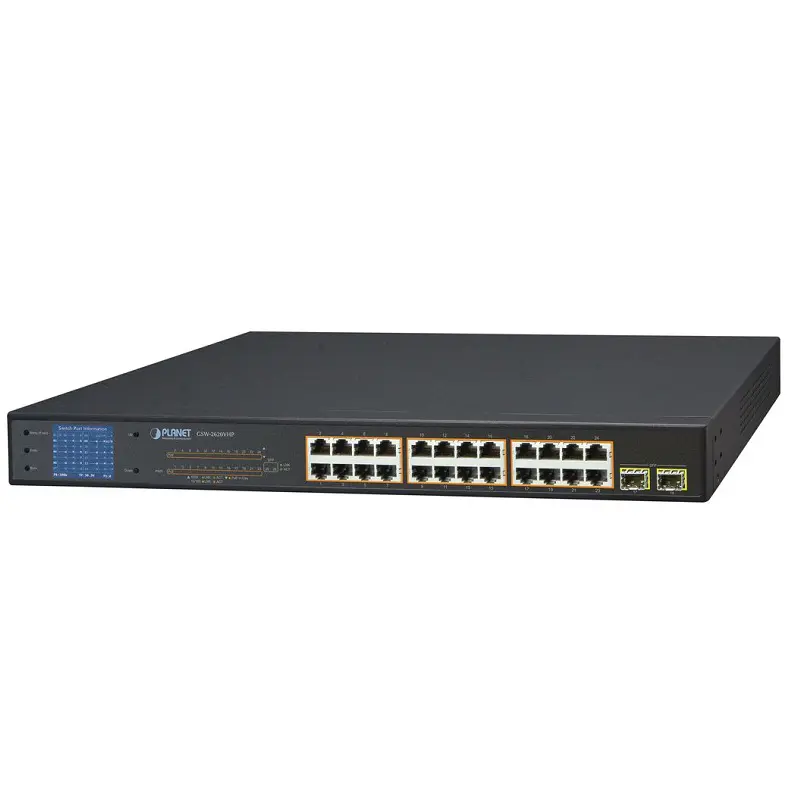 Il GSW-2620VHP è dotato di 24 porte 10/100/1000BASE-T con interfacce in rame 802.3at Power over Ethernet Plus (PoE+) da 30 watt e 2 slot SFP 1000BASE-X aggiuntivi con sistema di alimentazione interno. Con un budget di potenza PoE totale fino a 300 watt e prestazioni di commutazione dati non bloccanti, il GSW-2620VHP soddisfa la richiesta di potenza PoE sufficiente per la sorveglianza IP HD. Offre una soluzione di alimentazione delle dimensioni di un desktop, affidabile e visibile per le piccole imprese e gli integratori di sistemi che implementano reti Power over Ethernet.