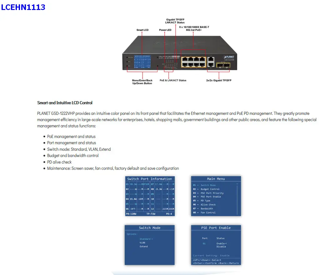 PLANET GSD-1222VHP is an ideal Plug and Watch Power over Ethernet solution which provides quick installation, real-time PoE work status monitoring and immediate troubleshooting through its unique LCD display to improve work efficiency and quality without any PC or software required.