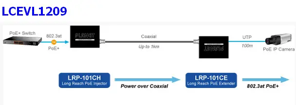 PLANET LRP-101C-KIT ETHERNET TRASM+RICEV 1-Port Long Reach PoE over coax Extender Kit (LRP-101CH + LRP-101CE) PLANET Long Reach PoE solution is designed to extend IP Ethernet transmission and inject power simultaneously into a remote 802.3af/at PoE compliant powered device (PD) beyond the 100 meters distance limit of Ethernet.