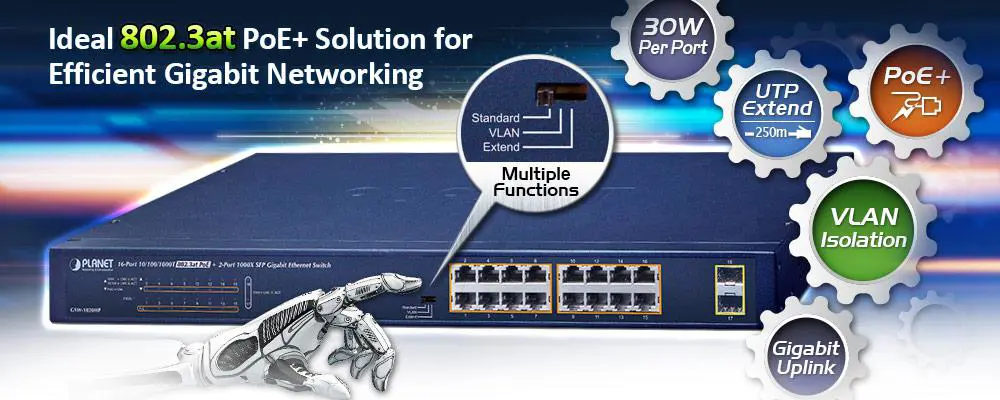 To facilitate 30W PoE power network applications with Gigabit speed transmission, the GSW-1820HP is equipped with 16 10/100/1000BASE-T Gigabit Ethernet ports and 2 1000BASE-X SFP interfaces with the inner power system. With a total of 240 watts of PoE budget, it features high-performance Gigabit IEEE 802.3af PoE (up to 15.4W) and IEEE 802.3at PoE+ (up to 30W) capabilities on all ports.
