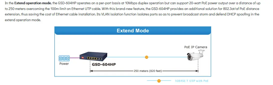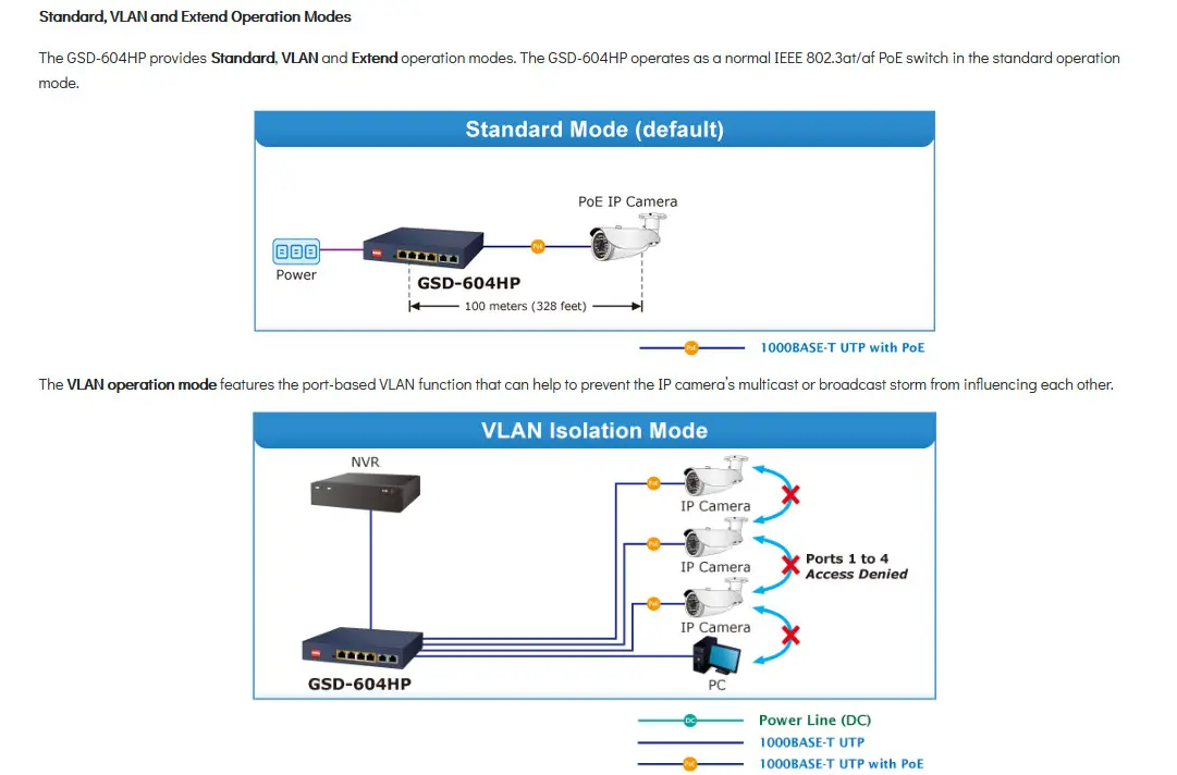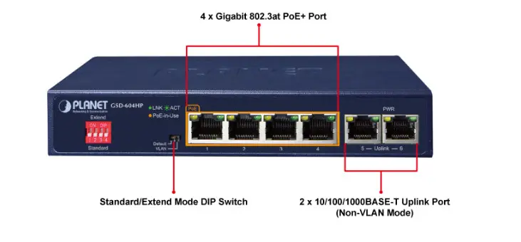 PLANET’s new GSD-604HP provides four 802.3at PoE+ ports for catering to small-scale IP surveillance or home networks at a lower total cost. With Dual 10/100/1000BASE-T uplink ports, the recorded HD video streams from the 4 PoE IP cameras can be powered by the GSD-604HP and saved in the 4-channel NVR systems or surveillance software to perform comprehensive security monitoring and manage the surveillance system in the LAN or the remote site via Internet.