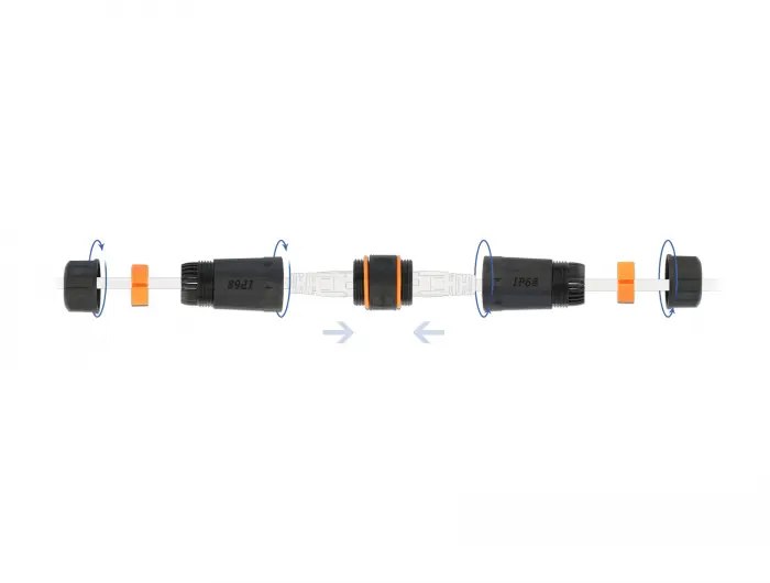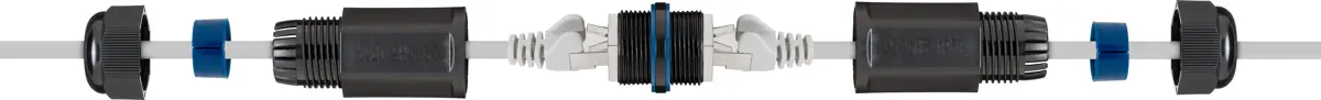 Il connettore del cavo è costituito da un totale di 5 parti in plastica (1 x giunto RJ45, 2 x custodia e 2 x tappo a vite) e 4 anelli. L'anello di tenuta in corrispondenza del foro passante della custodia sigilla le guarnizioni tra il cavo e la custodia. Può essere aperto lateralmente per consentire l'inserimento del cavo. Le due filettature delle viti direttamente sull'accoppiatore RJ45 sono ciascuna protetta da un anello di tenuta in silicone.