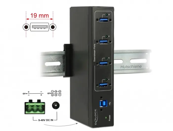 • Connettori: 1 x USB 3.0 Tipo-B femmina > 4 x USB 3.0 Tipo-A femmina - Specifica di carica batteria BC1.2 1 x jack 9 – 40 V CC 1 x connettore di alimentazione terminale a 3 pin