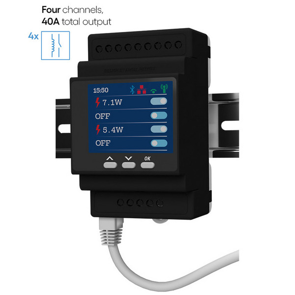 Shelly Pro 4PM is a one-phase, 4 channel smart relay equipped with LAN, Wi-Fi and Bluetooth connectivity, and precise power metering. Shelly Pro 4PM can be powered by 110-240V AC and installed inside the breaker box, allowing full smart automation from one centralized place. Enhanced with temperature and overload protection, Shelly Pro 4PM is a reliable device for a wide variety of applications. Use it in virtually any business facility to control and monitor the consumption of appliances, manage your costs, and enjoy endless functionalities support by using your own custom scripts.