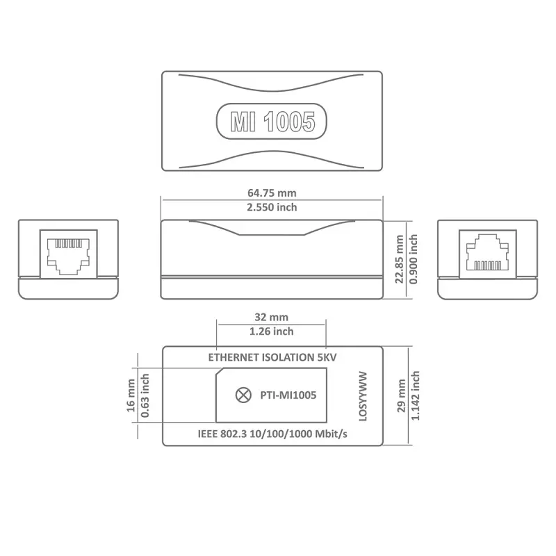 Il modulo MI 1005 è stato testato secondo le norme IEC / DIN EN 60601-1 and IEC / DIN EN 60601-1-2 da parte di un ente competente, in un laboratorio certificato. Il modulo MI 1005 è stato costruito in ottemperanza alle norme UL94-V0, utlizzando esclusivamente materiali rispondenti alle suddette norme. In confronto ad altri isolatori di rete dati, disponibili sul mercato, MI 1005 è l'unico con un isolamento da 5000 Volts AC, all'interno della piena compatibilità con gli standard IEEE 802.3ab 10/100/1000 Gigabit Network, senza alcuna restrizione sulla lunghezza massima dei cavi.
