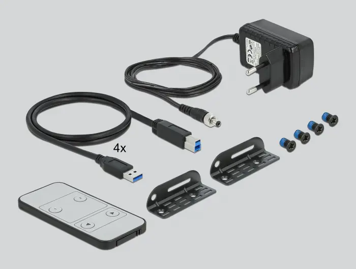 Contenuto della confezione • Switch KVM con USB e audio • Telecomando • 4 x cavo USB 3.0 A maschio per USB 3.0 tipo B maschio, lunghezza ca. 1,0 m • Alimentatore esterno • Staffe di montaggio e viti • Manuale utente