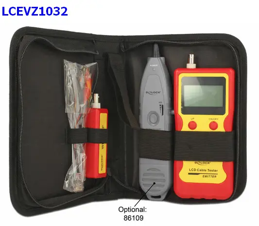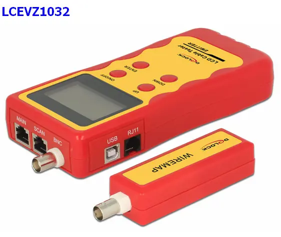 DELOCK xRJ45,RJ11,USB-CABLE LENGHT Questo tester per cavi Delock consente di testare vari tipi di cavi in modo rapido e semplice. I connettori sono disponibili per cavi modulari, cavi di rete, BNC e cavi USB. Gli errori nella mappatura sono chiaramente visibili sul display LCD illuminato. I cavi di rete possono essere testati per coppie invertite, che possono ridurre le prestazioni a causa di diafonia. Inoltre, può essere misurata la lunghezza dei cavi collegati. Per testare cavi già installati può essere utilizzata l'unità remota. • Tester 4 in 1 per cavi RJ45 / RJ12 / BNC / USB • Display LCD a matrice con retroilluminazione • 4 tasti operativi • Visualizzazione di collegamenti aperti, in corto o incrociati • Rilevamento di coppie invertite (diafonia) • Misurazione della lunghezza del cavo • Modalità di spegnimento automatico • Scomparto per batteria per una batteria da 1 x 9 V (non inclusa) • Colore: rosso • Dimensioni (LxPxA): ca. 185 x 80 x 32 mm • Batteria da 9 volt NON FORNITA