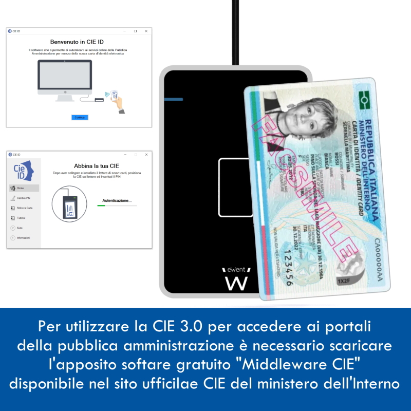 Il lettore EW1053 è pienamente compatibile con la CIE 3.0 (Carta di identità elettronica*) permettendo l’autenticazione con i massimi livelli di sicurezza nei servizi online degli enti che ne consentono l’utilizzo (Pubbliche Amministrazioni e/o soggetti privati).