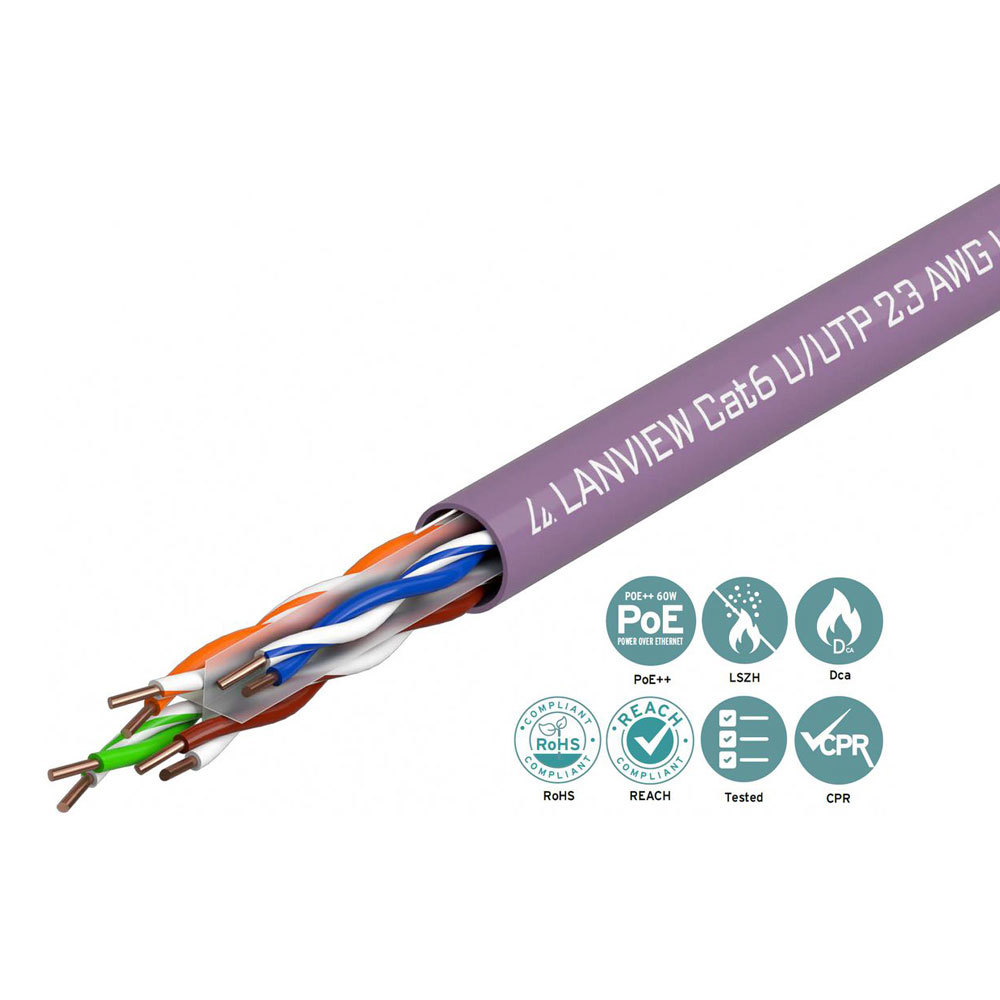 I cavi LSZH non schermati Lanview Cat6 sono prodotti e testati secondo gli standard ISO/IEC 11801, EIA/TIA 568B e EN50173-2. Classe di reazione al fuoco: Dca AWG 23 rame massiccio Classe EMC: B BOX REELEX da 305 mt Cavo contrassegnato dal metro