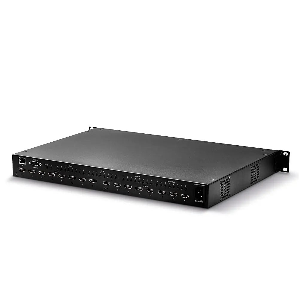 La funzione seamless switching consente di commutare tra le sorgenti senza alcuna latenza, perfetta per scenari in cui occorre un monitoraggio in tempo reale come uffici di vigilanza e sistemi di sicurezza. Il controllo può avvenire tramite i pulsanti sull'unità, telecomando IR, via LAN e RS-232 per integrare la matrice all'interno di un sistema di controllo programmabile.