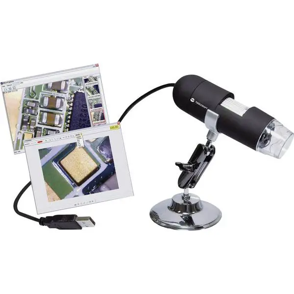Software per misurazioni in scala di distanze e superfici di oggetti ingranditi Lente per microscopio Dual Axis 27x e 100x Sensore di immagini CMOS Pulsante per scattare immagine singola Rotella per l'ingrandimento Illuminazione mediante 8 LED bianchi Impostazioni di illuminazione.