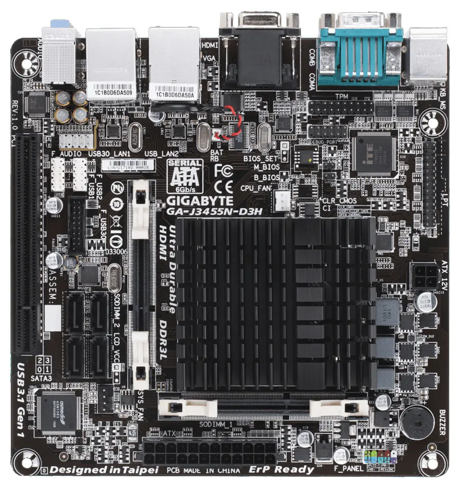 GIGABYTE J3455QC- DDR3L-2xGBe-2x RS232 High Quality Audio Capacitors Built-in Intel® Celeron™ J3455 (up to 2.3 GHz) quad-core processor Dual channel DDR3L SO-DIMM slot support Slot ad Interfaccia PCI Extra two SATA 6Gb/s interfaces for more system storage connectivity Dual GbE LAN with high ESD Protection Tecnologia GIGABYTE Ultra Durable™ All Solid Capacitors with Humidity Protection New Glass Fabric PCB design