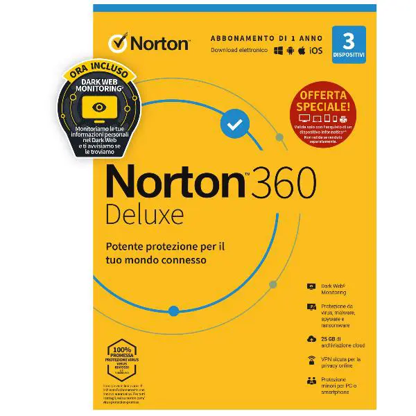 Protezione dalle minacce in tempo reale: la sicurezza avanzata multilivello ti aiuta a proteggerti dalle minacce malware esistenti ed emergenti per i tuoi dispositivi, compresi gli attacchi di phishing via e-mail e le falle della sicurezza nei siti Web. Sicurezza del dispositivo: protezione in tempo reale per 3 dispositivi contro ransomware, virus, spyware, malware e altre minacce online. Dark Web Monitoring monitora il Dark Web e ti informiamo se troviamo le tue informazioni personali, compresi i tuoi gamertag, i nomi utente e gli indirizzi e-mail. Secure VPN: naviga in modo anonimo e con maggiore sicurezza occultando il tuo indirizzo IP con una VPN senza tracciamento delle attività che contribuisce a proteggerti da attacchi DDoS, doxxing e SWATing. Password Manager: strumenti per generare, memorizzare e gestire facilmente le password, i dati delle carte di credito e altre credenziali online in modo più sicuro. 25 GB di backup del PC nel cloud: backup automatico e sicuro del PC nel cloud: archivia i tuoi file e documenti importanti e libera spazio sulle tue unità. SafeCam per PC contribuisce a proteggerti da potenziali blocchi dello streaming e da situazioni imbarazzanti grazie ad avvisi sui tentativi di accesso alla webcam, che ti consentono di bloccarli. Smart Firewall per PC o Firewall per Mac: aiuta a proteggere il dispositivo e i suoi dati da attacchi nocivi e sguardi invadenti. Protezione minori aiuta i tuoi figli, gestisci la loro attività online e identifica i potenziali pericoli prima che diventino un problema.