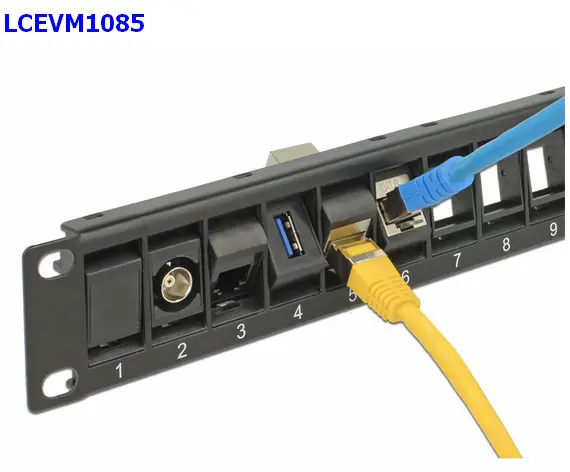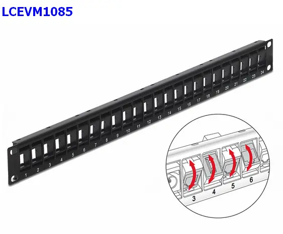 Specifiche • 24 Keystone ports 19.2 x 14.9 mm • Rotatable bearing of the Keystone ports • For mounting in 19? racks, 1 U • Material: Metal panel with plastic front bezel • Color: black • Dimensions (LxWxH): ca. 482.6 x 44.0 x 11.5 mm