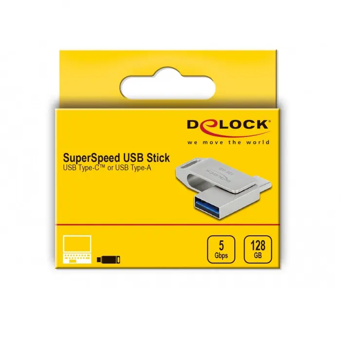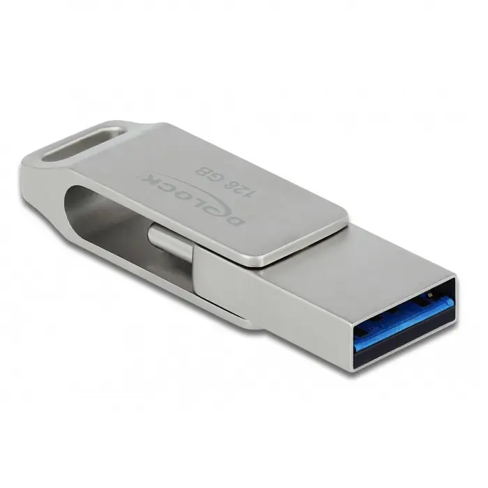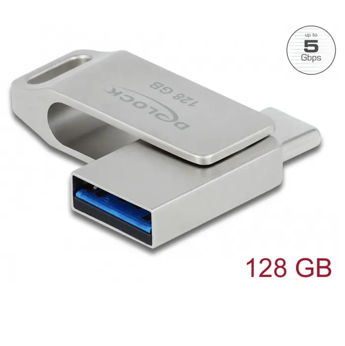 Questa chiavetta USB Delock può essere utilizzata per salvare e trasportare dati, ad esempio foto, video o musica. La chiavetta USB può essere collegata opzionalmente tramite la spina USB Type-C™ o USB di Tipo-A, la parte interna viene semplicemente girata e poi agganciata in posizione. Grazie al design elegante con occhiello, la piccola chiavetta USB può essere facilmente collegata al portachiavi per il trasporto.