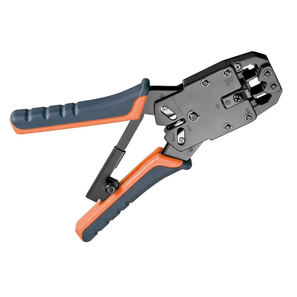 RJ10- RJ11/12- RJ45 PARALLELA+BLOCCO adatti anche per cavi non schermati per pressare spine modulari di tipo RJ 10, RJ 11/12, RJ 45 da 4, 6 e 8 poli con taglierini longitudinali e coltelli per lo smantellamento dei rivestimenti esterni dei cavi piatti di una lunghezza di 6 e 12 mm crimpatura precisa grazie al procedimento di crimpatura parallela qualità di crimpatura uniforme con la funzione di blocco forzato (sbloccabile) rafforzamento del taglio tramite la leva per un lavoro meno faticoso testa brunita