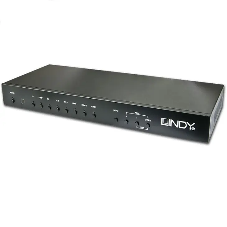 Switch con convertitore AV integrato dotato di 8 ingressi che possono essere trasformati e scalati per ottenere una risoluzione Full HD 1080p distribuita su 3 uscite. Queste caratteristiche ne fanno lo strumento ideale da installare in sale conferenze, aule di lettura o auditorium. Ognuno degli ingressi (3 x HDMI, 3 x VGA & Audio, Video Component & Audio e Video Composito & Audio) può essere visualizzato in simultanea sulle uscite (2 x HDMI e VGA). Queste tre uscite sono compatibili con diverse tipologie di schermi di vecchia e nuova generazione e possono supportare la connessione di extender Lindy HDMI e VGA per connessioni a distanza.