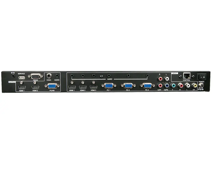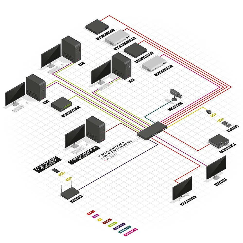 AV/HDMI/VGA 8in>2x HDMI+VGA - IP control Presentation Switch & Splitter AV a HDMI e VGA con Audio, 8 Porte -- Switch/Converter con 8 ingressi (HDMI, VGA, Component e Composito) e 3 uscite (2x HDMI e VGA/Component) Converte e scala 8 ingressi AV a risoluzioni fino a Full HD 1080p -- Accetta segnali HDMI, VGA, Component & Video Composito -- Uscite video VGA e 2 x HDMI in simultanea Gestione via IR, OSD, RS-232, Telnet e Web GUI (IP/Ethernet) Switch con convertitore AV integrato dotato di 8 ingressi che possono essere trasformati e scalati per ottenere una risoluzione Full HD 1080p distribuita su 3 uscite. Queste caratteristiche ne fanno lo strumento ideale da installare in sale conferenze, aule di lettura o auditorium. Ognuno degli ingressi (3 x HDMI, 3 x VGA & Audio, Video Component & Audio e Video Composito & Audio) può essere visualizzato in simultanea sulle uscite (2 x HDMI e VGA). Queste tre uscite sono compatibili con diverse tipologie di schermi di vecchia e nuova generazione e possono supportare la connessione di extender Lindy HDMI e VGA per connessioni a distanza. In aggiunta alle funzioni video, questo Switch effettua conversioni da digitale ad analogico, da analogico a digitale e fa da embedder audio analogico su segnali HDMI. Le uscite audio stereo 3.5mm e SPDIF coassiali possono essere connesse direttamente a ricevitori AV, mentre una delle due uscite HDMI può essere usata anche per segnali audio. Lo Switch è configurabile e controllabile da remoto via RS-232, Telnet e Web GUI e in locale via OSD e IR.
