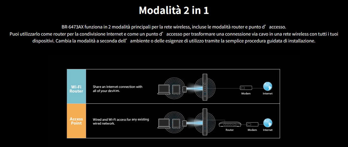 BR-6473AX funziona in 2 modalità principali per la rete wireless, incluse le modalità router e punto d’accesso.