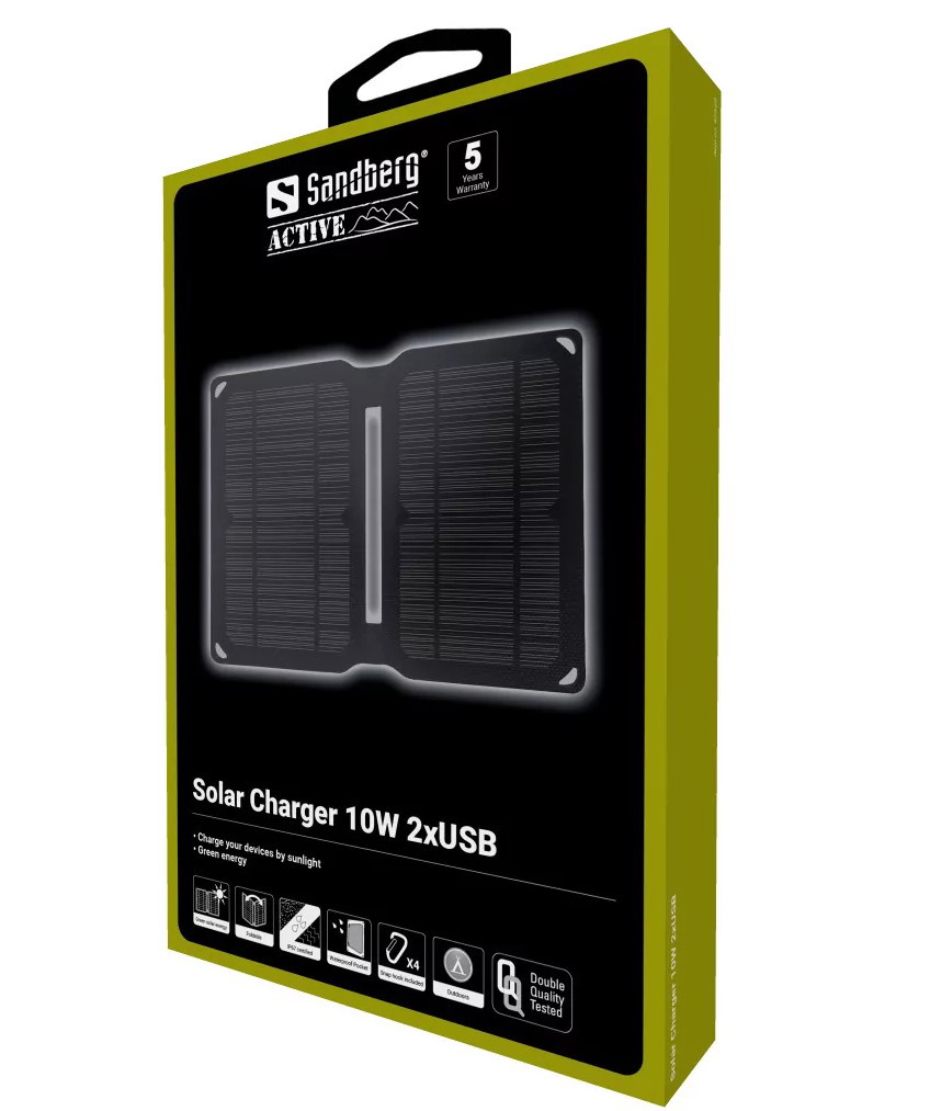Sandberg Solar Charger 10W 2xUSB Sandberg Solar Charger 10W 2xUSB è un pannello solare ad alta efficienza che trasforma luce solare in elettricità. Dispone di prese 2 USB che si possono usare per caricare dispositivi USB, come smartphone, tablet o accumulatori. Collegando un accumulatore si può immagazzinare elettricità per poi ricaricare uno smartphone, o lo si può usare come stabilizzatore durante la ricarica (se l'accumulatore supporta ingresso e uscita simultanei). I ganci in dotazione si possono usare, ad esempio, per fissare il pannello solare al tuo zainetto quando sei "in missione". Questa è elettricità ecologica per i tuoi dispositivi!