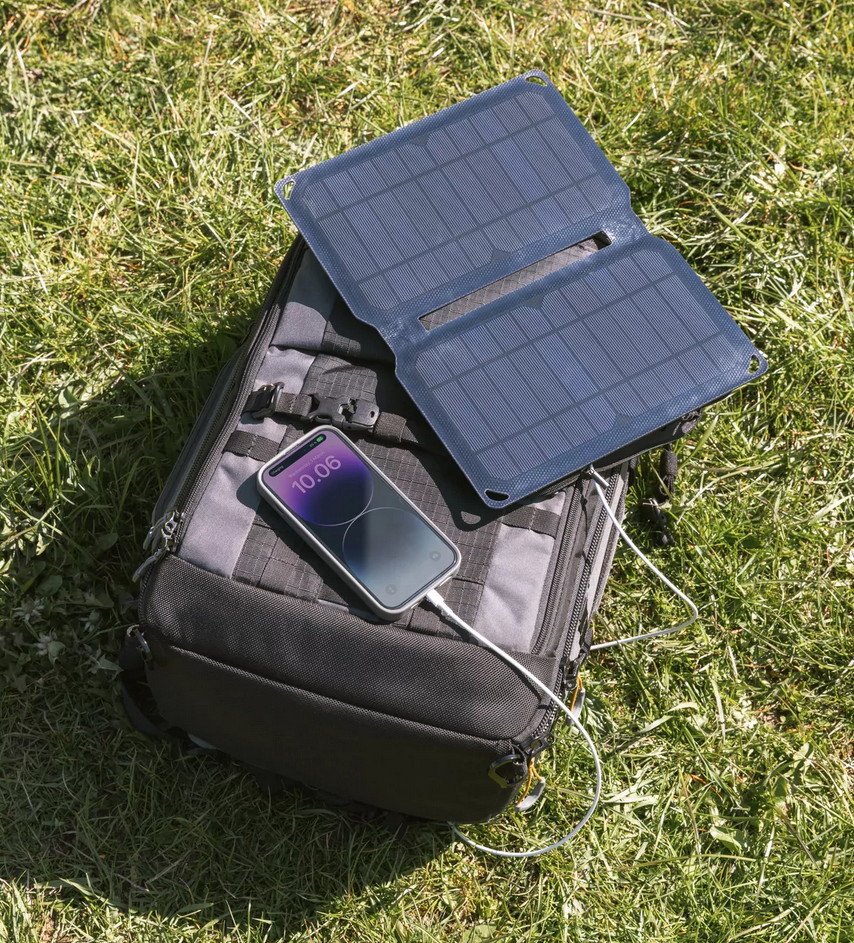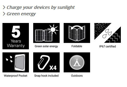 Solar panel output: 10 W / 6.3 V Solar cell: Monocrystalline. High efficiency 22% transfer rate Connectors: 2 x USB A female 5 V / 1 A USB Output: 2 x 5V/1A (Total 10W Max) Dimensions (unfolded): 32.5 x 25.2 x 0.3 cm Dimensions (folded): 16.1 x 25.2 x 1.8 cm Weight: 0.36 kg
