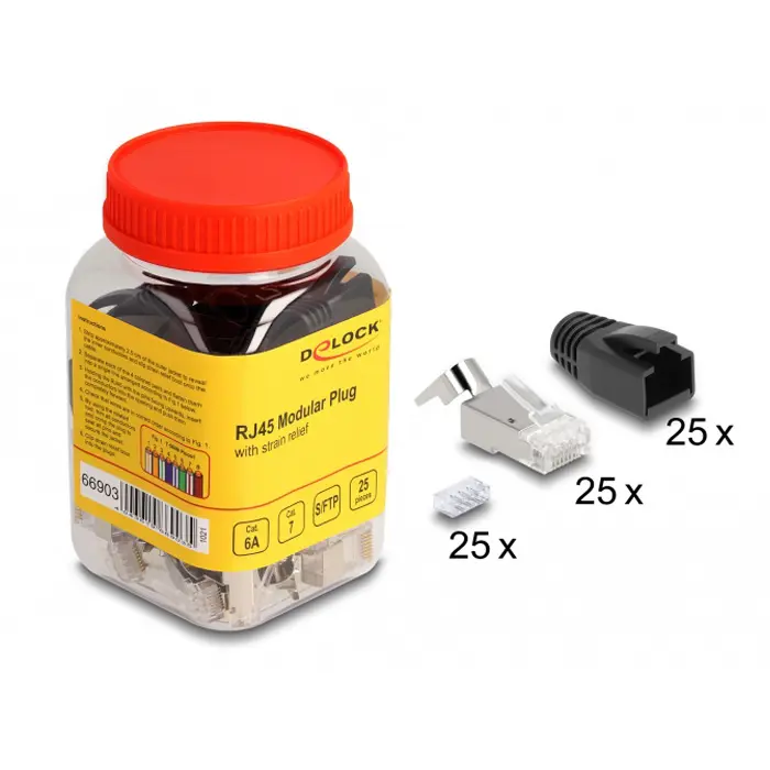 66903 CAVO STRAND/SOLID-RIGIDO AWG22-23 Delock Spina modulare RJ45 con scarico della trazione Cat.6A, Cat.7 e protezioni antipiega set da 25 pezzi