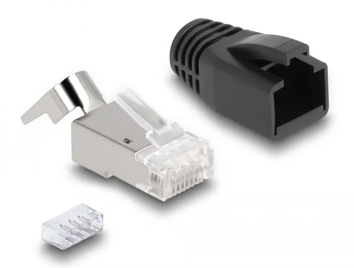Questo set di spine RJ45 di alta qualità Delock comprende spine RJ45 schermate con scarico della trazione, protezioni antipiega e un sistema di gestione dei cavi per un'installazione di montaggio ottimale dei cavi da 23 a 22 AWG.