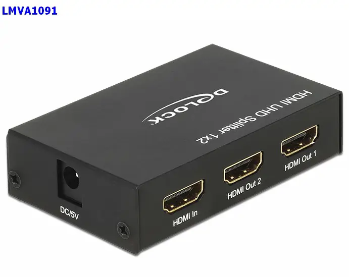 This splitter by Delock receives a HDMI signal from a PC or laptop and splits it to two connected displays. Thereby one HDMI connection can be used to operate two HDMI monitors.