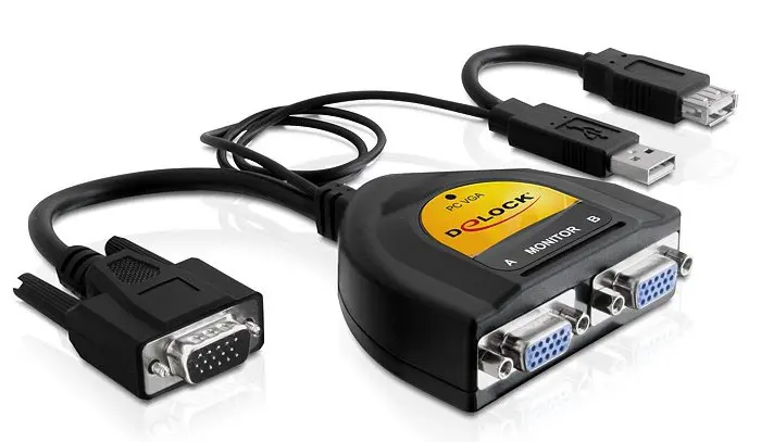 Specification Connector: Video output: 2 x VGA 15 pin female Video input: 1 x VGA 15 pin male Power supply: 1 x USB-A male 1 x USB-A female – can be used for other USB devices Supports: SVGA, VGA, XGA, WXGA, QXGA and Multi-Sync monitors Resolution: max. 2048 x 1536 Format: 4:3 VGA bandwidth: 450 MHz Supported cable length: up to 55 m Daisy Chain (cascadable) USB Bus Power, no additional power supply needed Plug & Play OS independent, no driver installation required