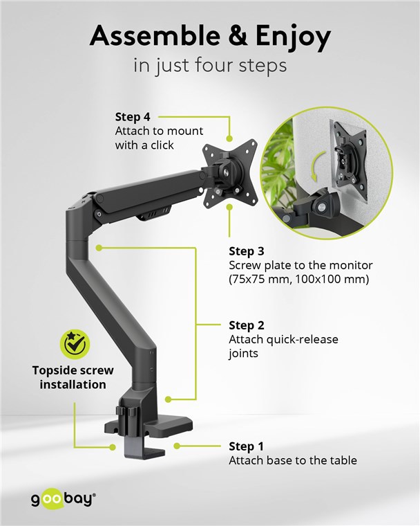 La serie Pro per il settore professionale: Con la sua base sottile, il robusto supporto per monitor in metallo è la soluzione salvaspazio per la scrivania in ufficio o a casa Perfetto per il montaggio stabile sul tavolo di uno schermo fino a 9 kg, regolabile in altezza, girevole di ±90° e inclinabile di ±45°, rotazione di 180°, spessore consigliato del piano del tavolo: 10-50 mm Installazione comoda grazie alla vite di facile accesso sulla parte superiore della base, senza scomodare il montaggio sotto il tavolo e senza allontanare i tavoli pesanti dalla parete Montaggio semplice: Nel primo passo, avvitare la piastra compatibile VESA® al monitor, nel secondo agganciarla al supporto per monitor e inserire il blocco La molla a gas con livello di pressione flessibile consente di portare il monitor nella posizione ergonomica ideale in qualsiasi momento e senza alcuno sforzo, per lavorare, giocare o videochiamare Il montaggio è facile e veloce grazie al materiale di montaggio incluso, sia con una vite con foro che con un morsetto da tavolo che può essere rimosso senza lasciare residui Il supporto per monitor è compatibile con gli standard VESA® 75x75 mm e 100x100 mm