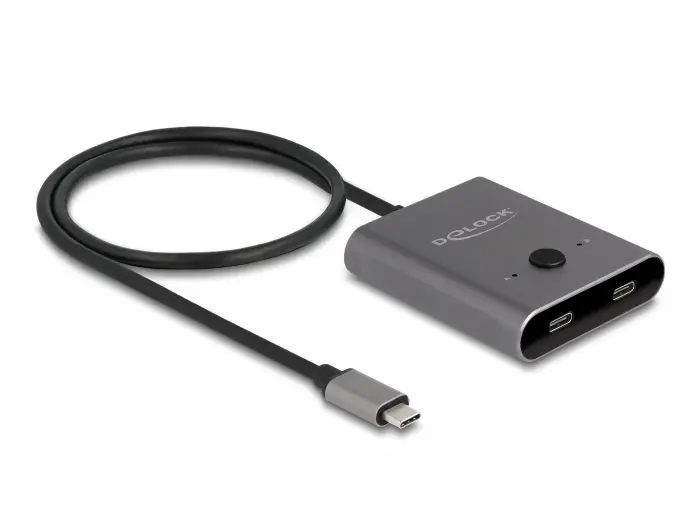 This USB Type-C™ switch by Delock is a manual bidirectional switch for connecting different devices with USB Type-C™ port. This switch offers two different applications. Function 1 One USB Type-C™ device like a monitor or external storage can be connected to two computers. With the push of a button, you can select the computer that will be connected to the device. Function 2 Two USB Type-C™ devices like a monitor or USB-PD charger can be connected to one computer. At the push of a button, the device that is connected to the computer can be selected.