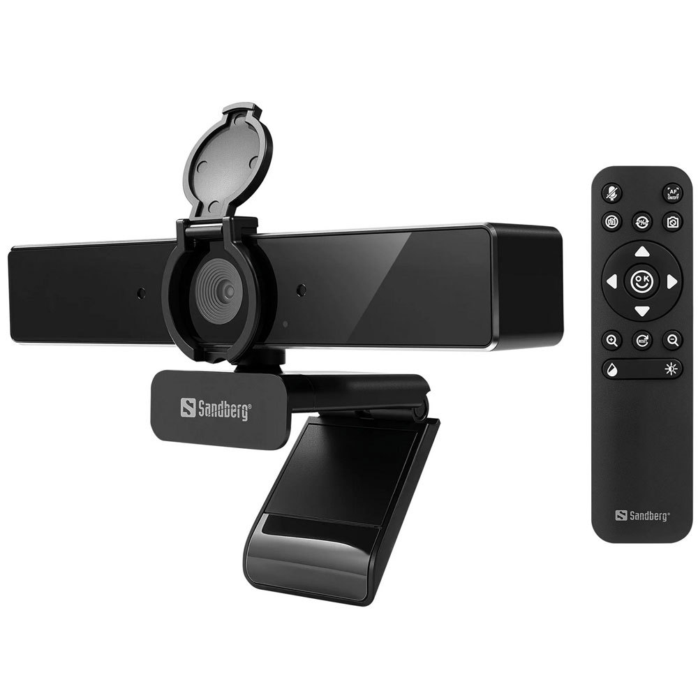 AUTOIMAGE 4k AF - 78° EPTZ Microfono La webcam perfetta per le tue video riunioni. Sandberg 4K Webcam ti assicura di apparire sempre professionale con video cristallini e audio straordinario. L'alta risoluzione, la messa a fuoco automatica e la correzione della luce, insieme al campo visivo ampio, ti fanno apparire al meglio, ovunque tu sia. Con il telecomando incluso, puoi regolare facilmente la fotocamera durante la riunione, dandoti il pieno controllo. La fotocamera ha anche una pratica copertura per la privacy, così puoi sentirti sicuro quando non è in uso.