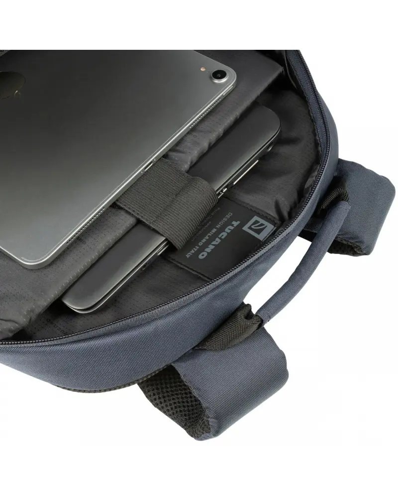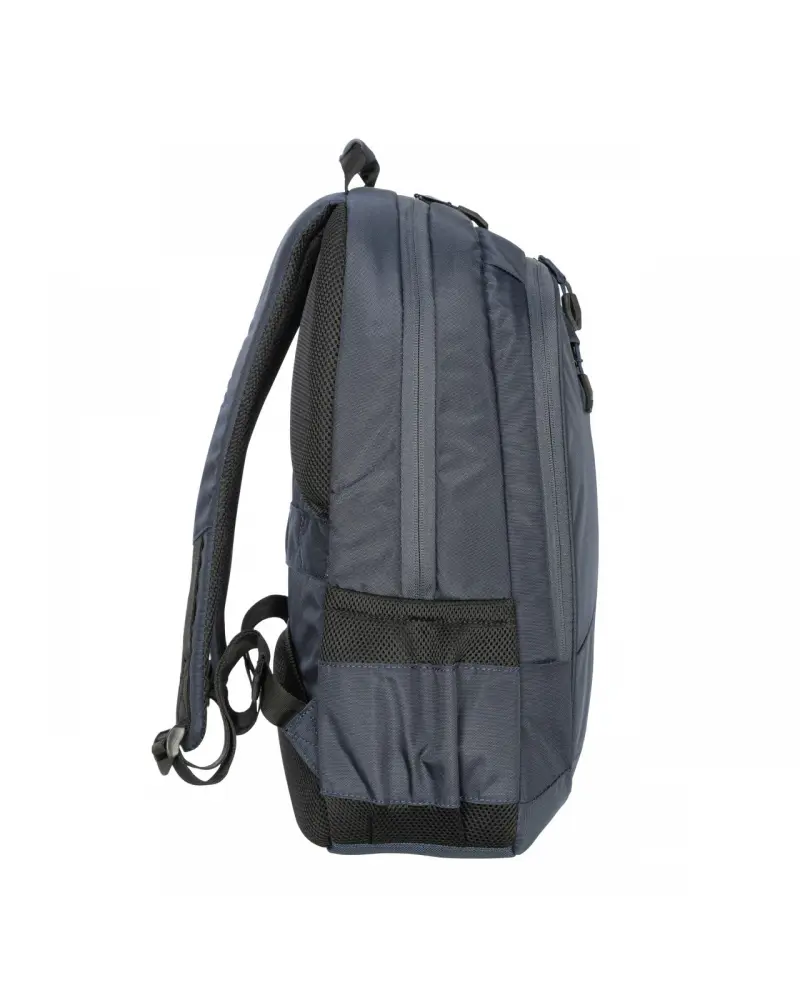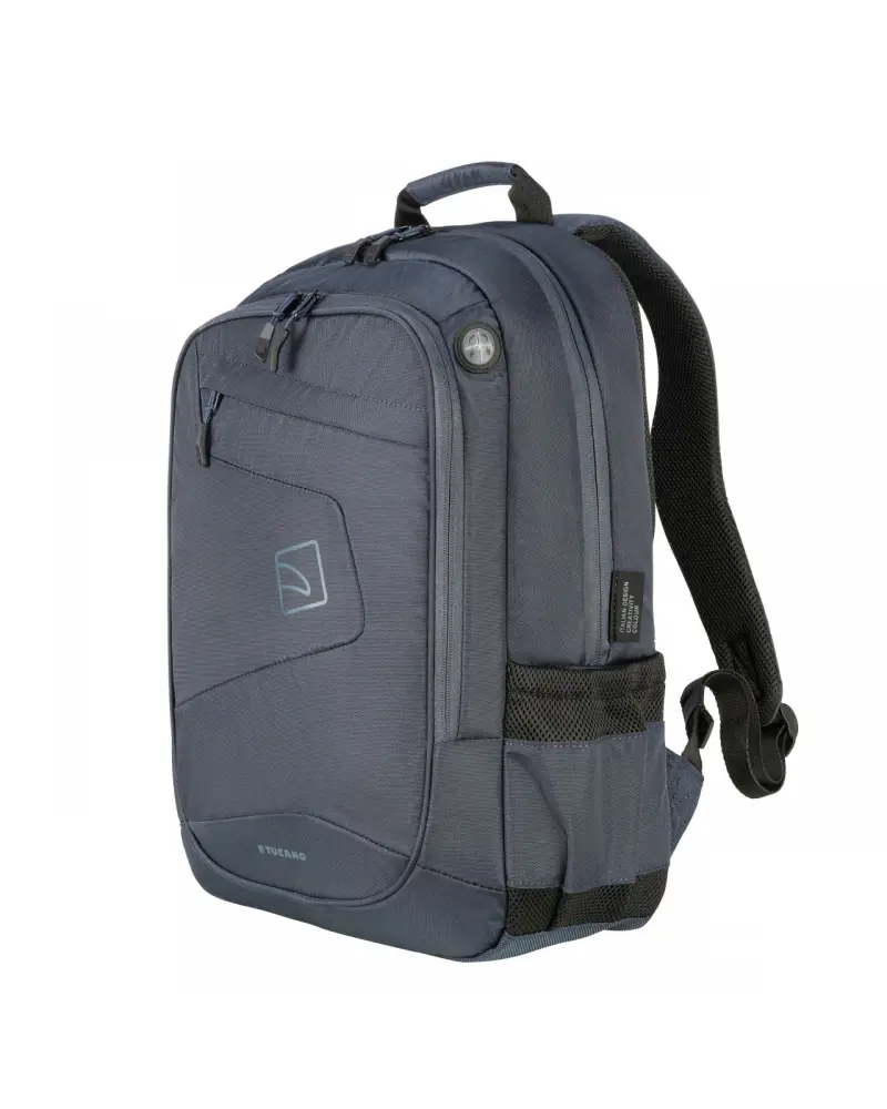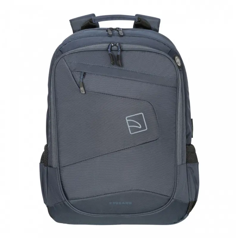 Zaino sportivo e business per laptop fino a 17" e MacBook 16", in materiale tecnico, con tasca esterna frontale organizzata e tasca piccola per accessori entrambe con zip. Un piccolo foro dedicato, consente l'uscita degli auricolari. L'ampio vano interno è dotato di una tasca imbottita per laptop o MacBook. Lateralmente vi sono due tasche elastiche per bottiglia, ombrello ed oggetti di dimensioni simili. Il lato posteriore, con schienale ergonomico e spallacci, regolabili e imbottiti, è provvisto di una fascia per il trolley.
