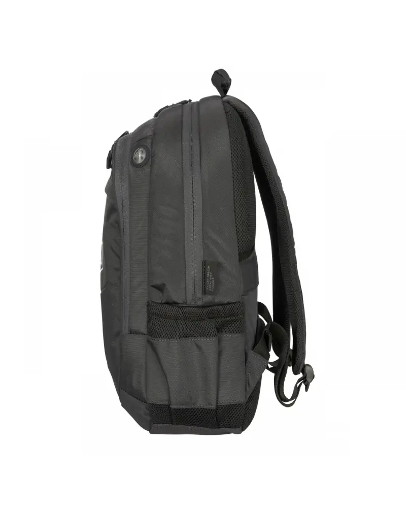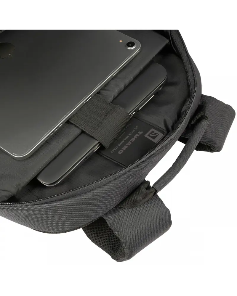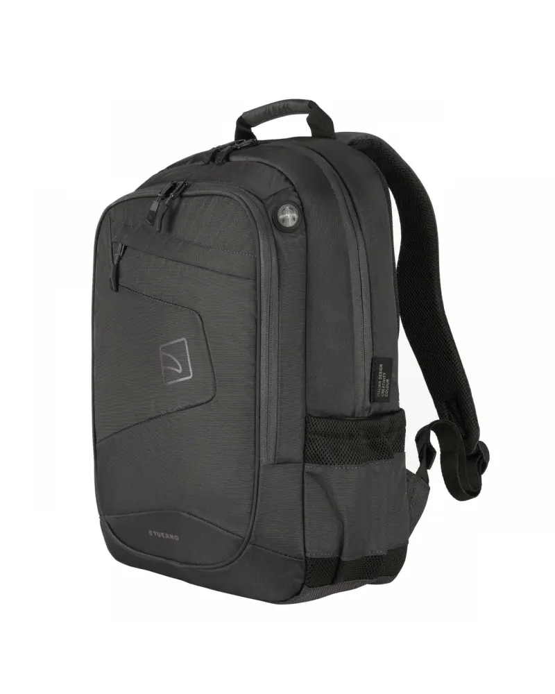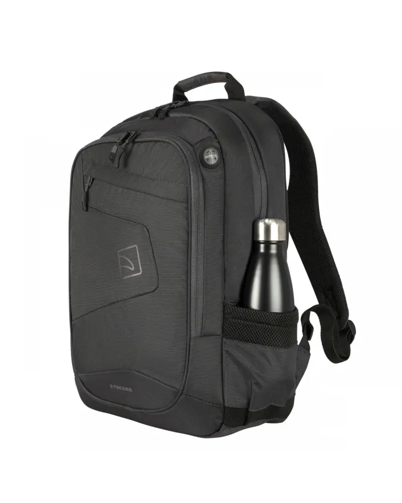 Zaino sportivo e business per laptop fino a 17" e MacBook 16", in materiale tecnico, con tasca esterna frontale organizzata e tasca piccola per accessori entrambe con zip. Un piccolo foro dedicato, consente l'uscita degli auricolari. L'ampio vano interno è dotato di una tasca imbottita per laptop o MacBook. Lateralmente vi sono due tasche elastiche per bottiglia, ombrello ed oggetti di dimensioni simili. Il lato posteriore, con schienale ergonomico e spallacci, regolabili e imbottiti, è provvisto di una fascia per il trolley.