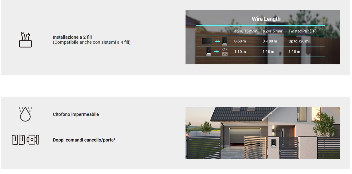 Risoluzione 2K. Monitor interno schermo touch a colori da 7 pollici. Sblocco remoto di porta/cancello. Smart RFID Unlock (3 tag inclusi). Campanello integrato con suonerie multiple. Rilevamento intelligente del movimento umano. Supporta scheda MicroSD opzionale (fino a 512 GB) e EZVIZ CloudPlay Storage. Connessione unità esterna e interna, tramite cavo 2 fili. Comando per apertura serratura.